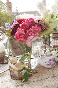 ウェディングブーケにあわせてお客様のテーブルもカルーセルのバラでコーディネート。 芳しい高貴なバラのテーブルフラワーもお帰りにお持帰りいただくので、ウェディングの余韻が続きます。 |